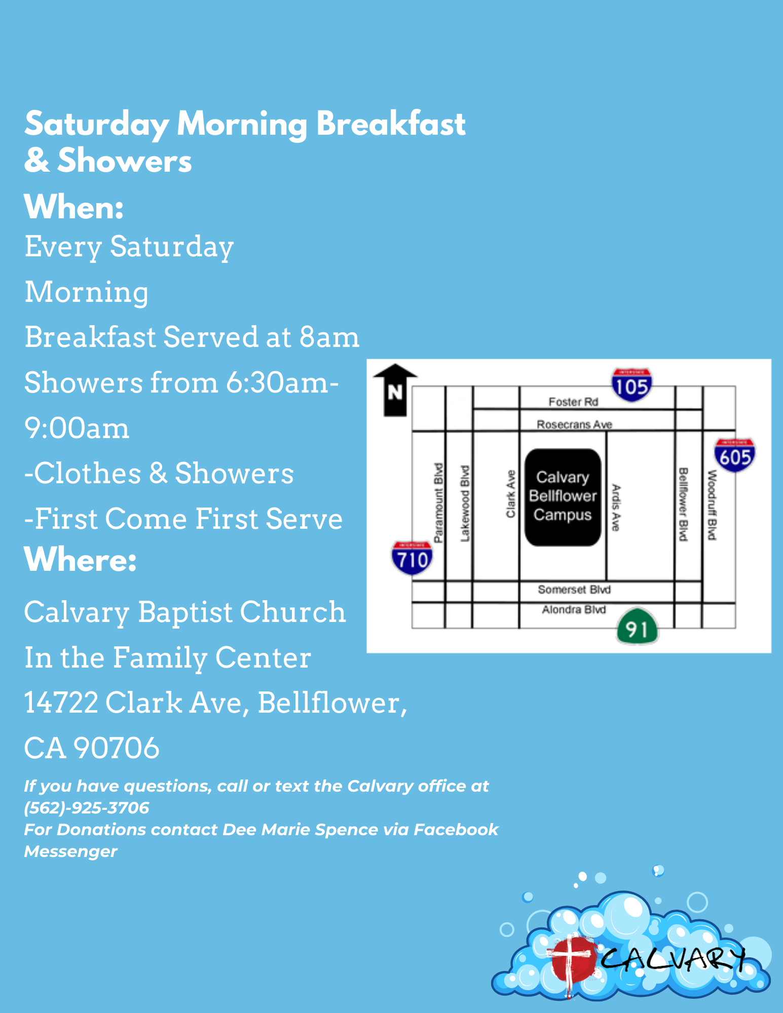 Our Homeless Breakfast & Showers Ministry is designed to nurture the less fortunate in our community and to bring them to Christ through showing His love in actions! All volunteers should be in the Family Center by 6:30am and breakfast starts being served by 8:00am! We would love for you to come help!